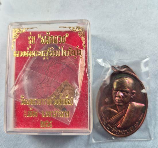 เหรียญ พลิกดวงเนื้อทองแดงผิวรุ้ง พระอาจารย์สุริยันต์ วัดป่าวังน้ำเย็น ปี 2564 หมายเลข 6961 พร้อมกล่องเดืมๆแถมเกษาจีวร |