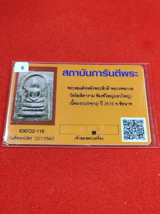 พระสมเด็จหลังพระสิวลี หลวงพ่อกวย วัดโฆสิตาราม พิมพ์ใหญ่เอวใหญ่ เนื้อผงบรรจุกรุ ปี 2515 จ.ชัยนาท พร้อมบัตรรับรอง