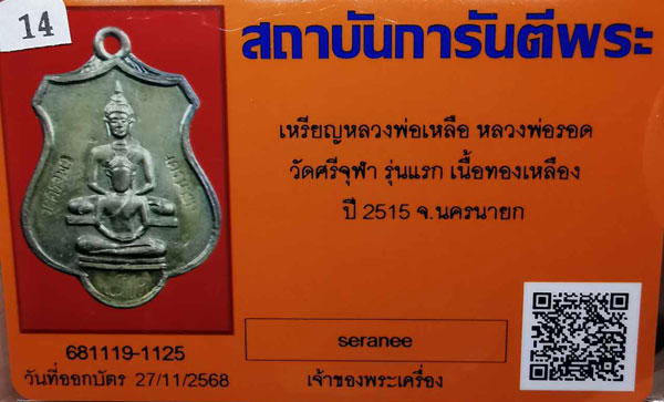 เหรียญหลวงพ่อเหลือ หลวงพ่อรอด วัดศรีจุฬา รุ่นแรก เนื้อทองเหลือง ปี2515 จ.นครนายก + บัตรG-pra สภาพเดิมค่ะ สภาพตามรูปทุกประการค่ะ