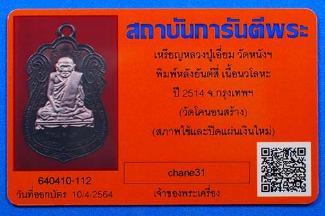 เหรียญหลวงปู่เอี่ยม วัดหนัง พิมพ์หลังยันต์สี่ เนื้อนวโลหะ ปี 2514 จ.กรุงเทพ (วัดโคนอนสร้าง) พร้อมบัตรรับรองสถาบันการันตีพระ |