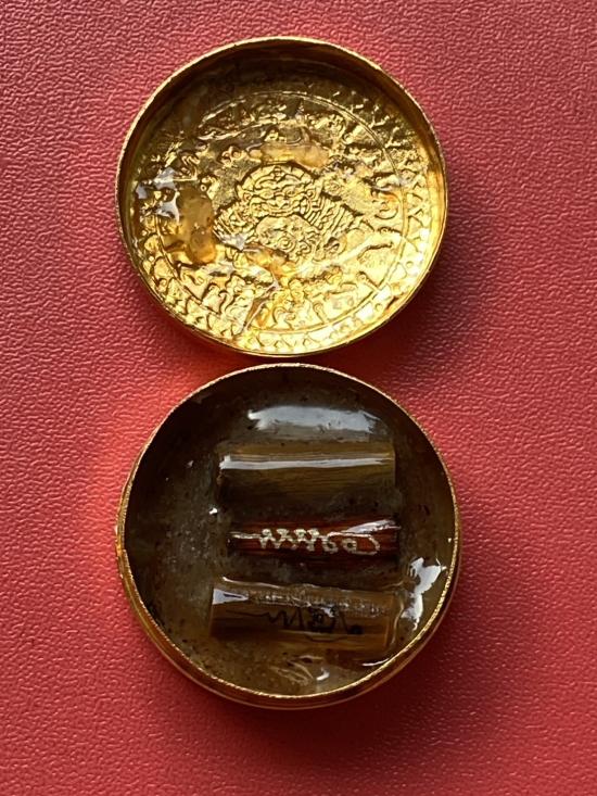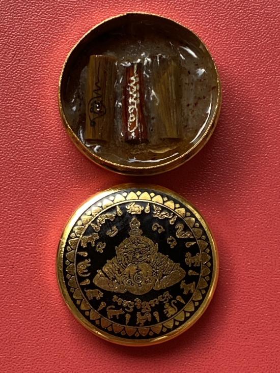 เคาะเดียวแดง สีผึ้งพระราหู รุ่น มงคลจักรวาล เนื้อ โลหะชุบทองลงยาสีดำขอบสีแดง ขนาด3.2ซม |