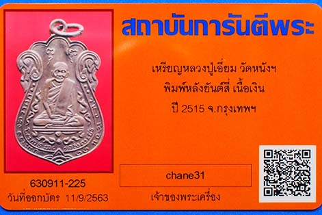 เหรียญหลวงปู่เอี่ยม วัดหนัง พิมพ์หลังยันต์สี่ เนื้อเงิน ปี 2515 จ.กรุงเทพ พร้อมบัตรรับรองสถาบันการันตีพระ |