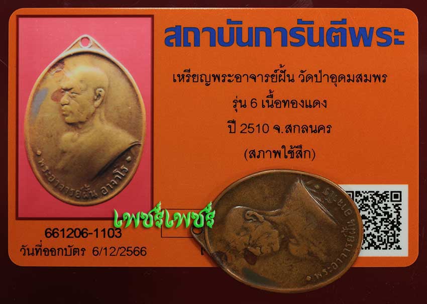 เหรียญ พระอาจารย์ฝั้น วัดป่าอุดมสมพร รุ่น6 เนื้อทองแดง ปี2510 จ.สกลนคร สภาพกำลังน่าใช้ หายาก พร้อมบัตรรับรองพระแท้จากการันตีพระสบายใจได้พระแท้แน่นอน ค่ะ