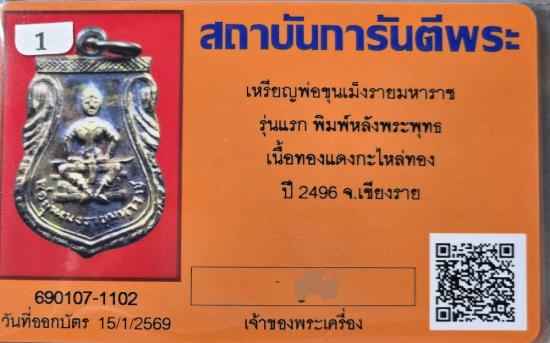 เหรียญพ่อขุนเม็งรายมหาราช รุ่นแรก ปี 2496 หลังพระพุทธ เนื้อทองแดงกะไหล่ทอง สวยพร้อมบัตรรับรอง