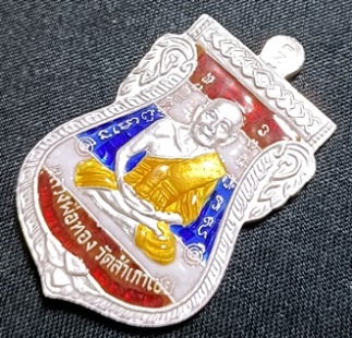 หลวงปู่ทวดอาจารย์ทอง เสมาหน้าเลื่อน เนื้อเงินลงยาสีธงชาติ แซยิด93 กล่องเดิม ซีลเดิม หมายเลข 156 มีรอยแตะด้านหลังตรงจมูกหลวงพ่อตามรูป แดงที่ 600.- |