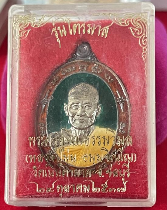เหรียญไตรมาสหลวงปู่ม่น วัดเนินตามาก จ.ชลบุรี ปี๒๕๓๗ เนื้อเงินลงยา พร้อมกล่อง |