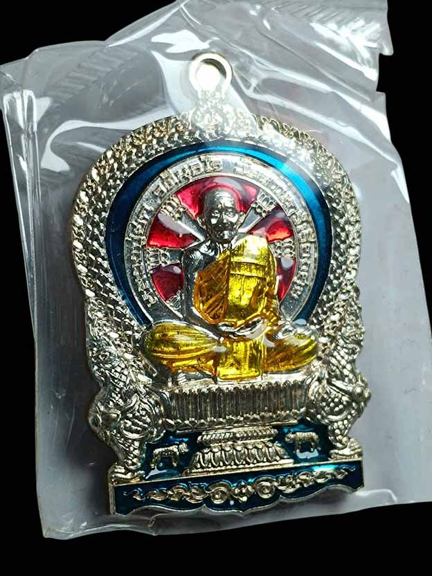 เหรียญนั่งพานสำเภาทอง หลวงปู่ฮก วัดราษฏร์เรืองสุข จ.ชลบุรี ปี พ.ศ.2558 เนื้ออาบเงิน ลงยาสี ตอกโค้ต หมายเลข 5141 ซีลเดิม พร้อมกล่อง ผิวสวยๆ |