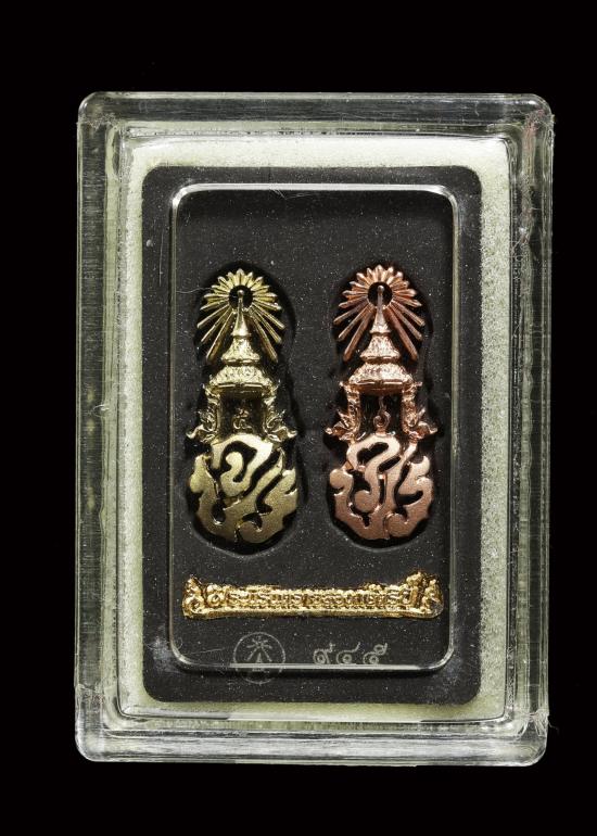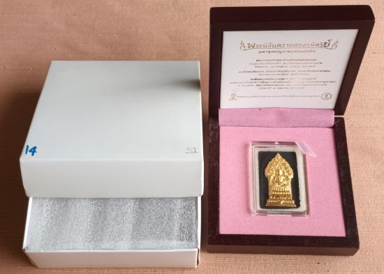 พระนิรันตรายสองกษัตริย์ พระผงพิมพ์สมเด็จหน้าปัดทอง สีดำ ((( หลังฝังโลหะเงินสองกษัตริย์ ชุบทอง+ชุบนาก ))) ไม่ผ่านใช้ กล่องเดิม