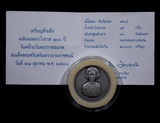 เหรียญที่ระลึก100 ปี พระราชสมภพสมเด็จย่า ปี 2543 เนื้อเงินรมดำพ่นทรายพิเศษ กล่อง+ใบ แดงเคาะแรก