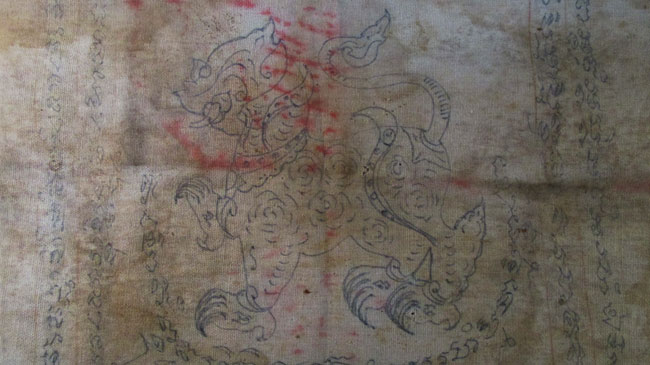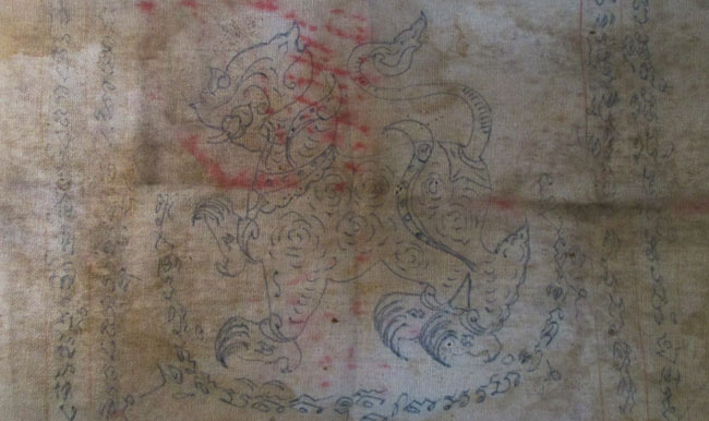 ผ้ายันต์ ไม่ทราบที่ จารยันต์ด้วยมือ ยันต์สวย เนื้อผ้าดูเก่า ครับ