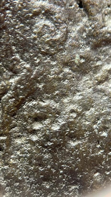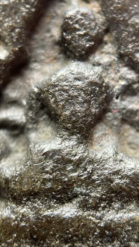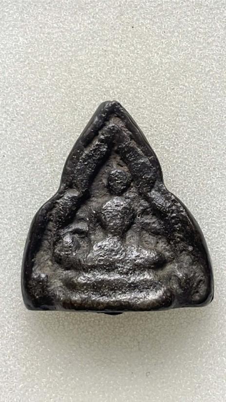 รูปหล่อสามเหลี่ยมเนื้อสัมฤทธิ์อุดครั่งแดง ไม่ทราบเกจิ วัดใจ จบเท่าไหร่เท่านั้นพระเหมามา |