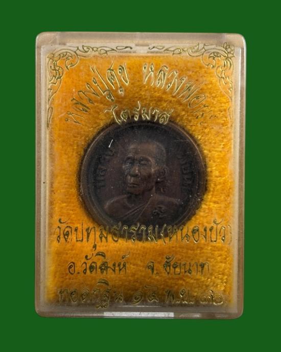 หลวงปู่ศุข หลวงพ่อนะ ไตรมาส ปี36 วัดหนองบัว จ.ชัยนาท กล่องเดิม เนื้อทองแดง เหรียญหนาสวยๆ |