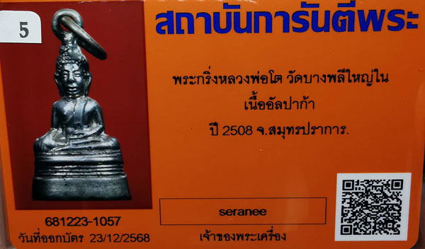 พระกริ่งหลวงพ่อโต วัดบางพลีใหญ่ใน พิมพ์มีหู เนื้ออัลปาก้า ห่วงเดิม ปี2508 จ.สมุทรปราการ + บัตรG-pra สภาพเดิมค่ะ สภาพตามรูปทุกประการค่ะ