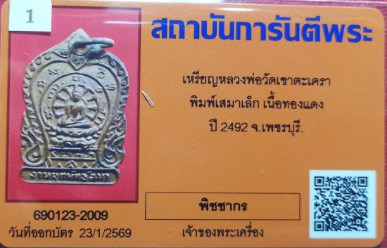 เหรียญเสมาเล็ก ลพ.วัดเขาตะเครา เนื้อทองแดง ปี2492 จ.เพชรบุรี พร้อมบัตรรับรอง |