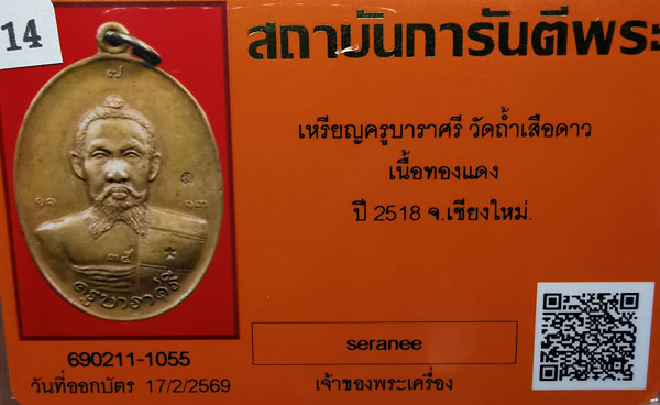 เหรียญครูบาราศรี วัดถ้ำเสือดาว เนื้อทองแดง ห่วงเดิม(พิเศษตอกโค้ต) ปี2518 จ.เชียงใหม่ + บัตรG-pra สภาพเดิมค่ะ สภาพตามรูปทุกประการค่ะ