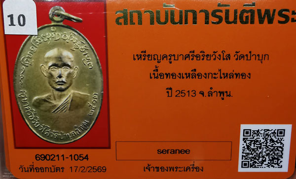 เหรียญหลวงครูบาศรีอริยวังโส วัดป่าบุก เนื้อทองเหลืองกะไหล่ทอง ห่วงเดิม ปี2513 จ.ลำพูน + บัตรG-pra สภาพเดิมค่ะ สภาพตามรูปทุกประการค่ะ