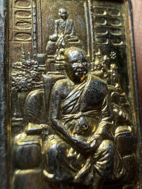 วัดใจ เคาะเดียว เหรียญทำน้ำมนต์ หลวงพ่อฤาษีลิงดำ นั่งโซฟารับแขก โดยหลวงพ่ออนันต์ ด้านหลังเป็นยันต์ทำน้ำมนต์ของพระสารีบุตร และมีบทที่พระสวดให้พรที่เรียกว่า "มงคลจักรวาลน้อย" ปี2555