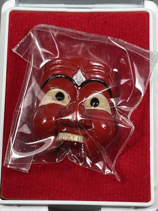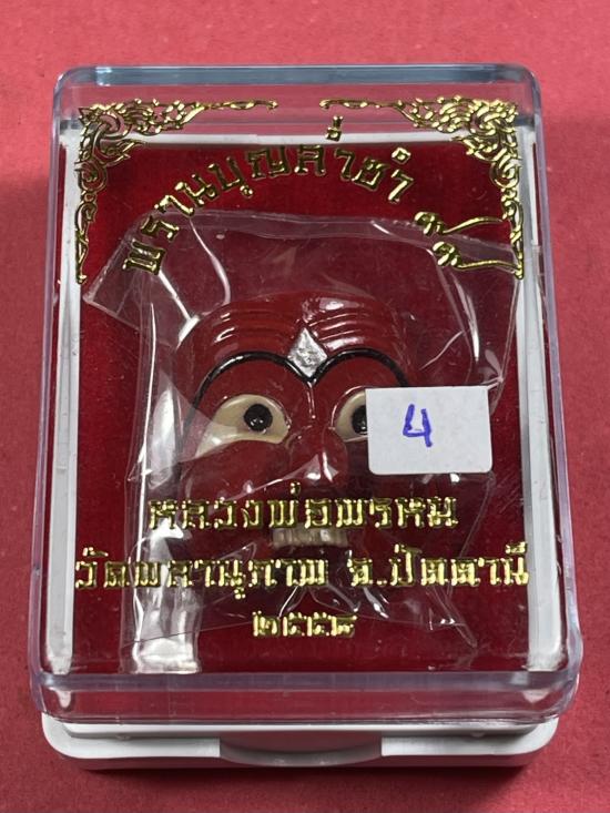 หน้ากากพรานบุญ รุ่น ล่ำซำ99 พ่อท่านพรหมวัดพลานุภาพ จ.ปัตตานี ปี2558 เนื้อทองแดงลงยา (หน้าแดง) พิมพ์ใหญ่ หลังอุดมวลสาร ฝังตะกรุด+จีวร+เกษา ตอกโค้ด เลข4