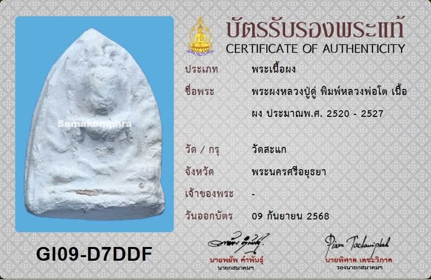 พระหลวงปู่ดู่ วัดสะแก พิมพ์หลวงพ่อโต หลังปั้มตรายาง3จุด เนื้อผงพุทธคุณผสมปูน พร้อมบัตรสมาคม สภาพสวย ขี้เบ้าดินนำมันยัดติดอยู่ แท้นับ1 |