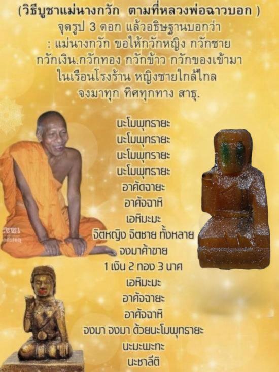 หลวงพ่อฉาว ท่านอธิษฐานจิตปลุกเสกแม่นางกวัก จนกระทั่งแม่นางกวักสั่น จึงออกให้เช่าบูชากัน พุทธคุณทุกๆด้านจะไม่เหมือนกับแม่นางกวักสายอื่นๆที่มีพุทธคุณทางด้านค้าขาย เมตตามหานิยมเพียงอย่างเดียว แต่แม่นางกวัก ที่ท่านปลุกเสก มีประสบการณ์ด้านอื่นๆกับลูกศิษย์ลูกหา อาทิเช่น ชาวบ้านในพื้นที่ได้พกพาแม่นางกวัก แขวนไว้ที่กระจกรถยนต์เกิดอุบัติเหตุ รถยนต์คว่ำอย่างรุ่นแรง รถเสียหายจนไม่สามารถซ่อมแซ่มได้ แต่คนขับที่บูชาแม่นางกวัก กลับไม่เป็นอะไรเลยแม้แต่น้อย อีกรายมีเรื่องทะเลาะวิวาทกัน โดนปืนยิงอย่างจัง แต่ลูกปืนกลับไม่ระคายผิวแต่อย่างได เพียงแต่เป็นแค่จุดแดงๆเท่านั้น ส่วนพ่อค้าแม่ค้านำไปค้าขาย ก็ขายดีมากๆ แต่ต้องจุดธูปบอกกล่าวเป็นประจำ ขอให้แม่นางกวักช่วยเหลือในเรื่องการค้าการขาย หรือจะทำสิ่งหนึ่งสิ่งใด ก็ให้บอกกล่าวขอกับแม่นางกวักครับ