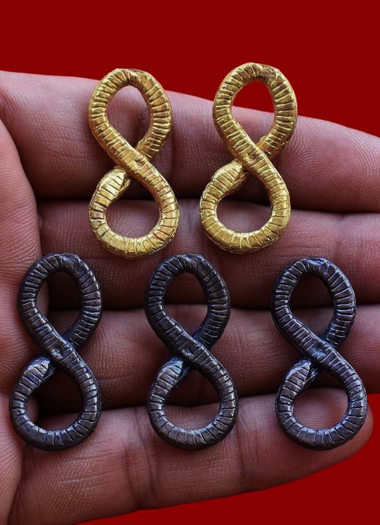 ชุด 5 องค์...งูกินหาง (ตำรับพิสดาร) เนื้อทองแดงผสมฯ + ทองสตางค์ผสมโลหะอาถรรพณ์ ปี 2556 พระครูน้อย วัดชัยมงคล จ.สุพรรณบุรี พร้อมซองรูปเดิมจากวัด สภาพพระตามรูปที่ลงทุกประการ (ขนาดประมาณ 3.5 x 1.5 ซม.)