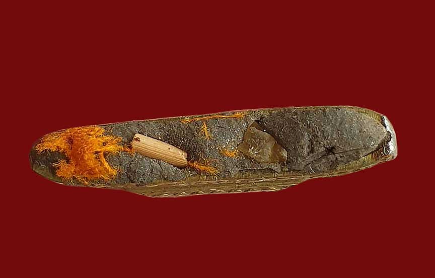 ผงที่ใช้อุดก็เป็นผงชุดฤษีอริยะธาตุกับฤษีชอนสารเดชเป็นหลัก โดยเพิ่มเติมข้าวก้นบาตรที่เสกแล้วของหลวงปู่เปลี้ยฝังให้เห็นเป็นเม็ดๆ ฝังจีวรและหญ้าคาที่เป็นไม้พรมน้ำมนต์ของหลวงปู่เปลี้ยโดยเลือกเอาหญ้าคาอัน ที่เกิดแสงประหลาดในภาพถ่ายที่เคยลงตีพิมพ์ไปแล้ว