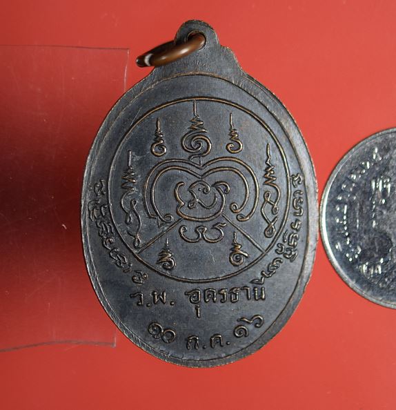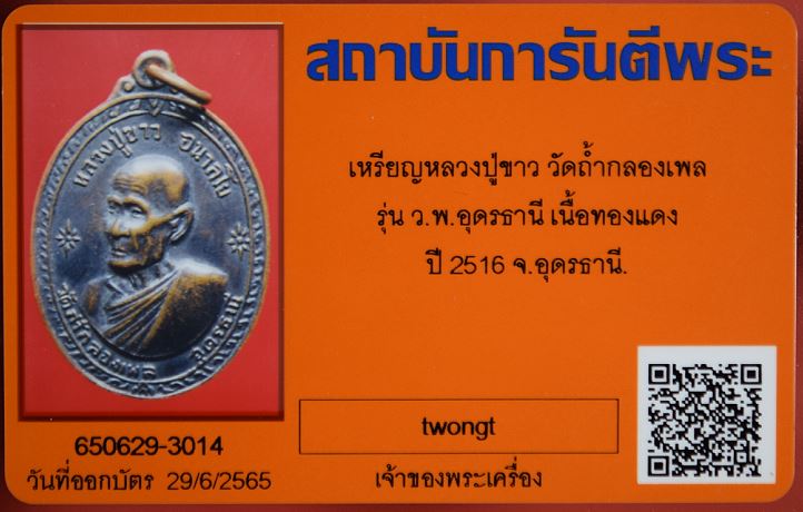 เหรียญหลวงปู่ขาว วัดถ้ำกลองเพล รุ่น ว.พ. อุดรธานี เนื้อทองแดงรมดำ ปี 2516 จ.อุดรธานี พร้อมบัตรรับรอง เคาะเดียวแดง |