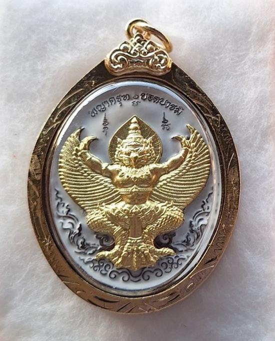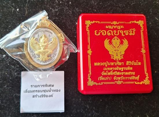 เหรียญพญาครุฑ หลวงปู่ศิลา วัดโพธิ์ศรีสะอาด รุ่นยอดบารมี ลังนำฤกษ์ เนื้อชนวนหน้ากากทองทิพย์ พื้นขาว เลี่ยมกรอบชุบน้ำทอง No.39 |
