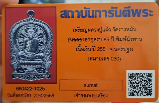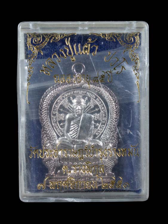 3500 เหรียญนั่งพาน หลวงปู่แผ้ว ปวโร วัดรางหมันปี 2551 เนื้อเงิน หมายเลข 030