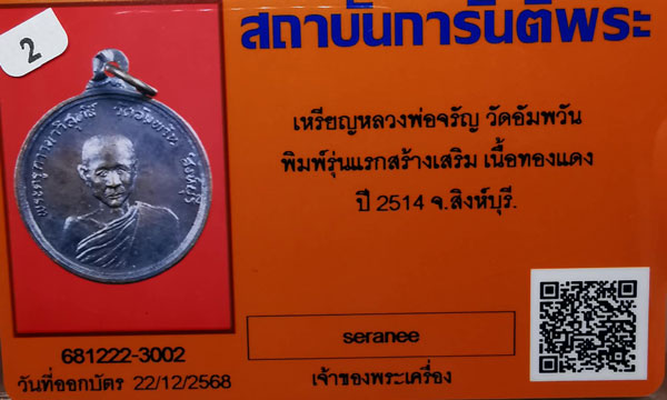 เหรียญหลวงพ่อจรัญ วัดอัมพวัน รุ่นแรกพิมพ์สร้างเเสริม เนื้อทองแดง ห่วงเดิม ปี2514 จ.สิงห์บุรี + บัตรG-pra สภาพสวยเดิมค่ะ |