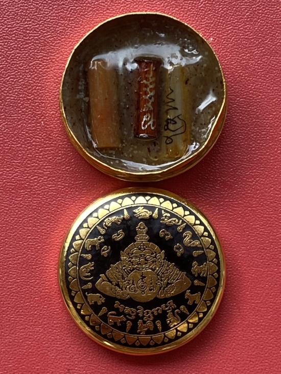 เคาะเดียวแดง สีผึ้งพระราหู รุ่น มงคลจักรวาล เนื้อ โลหะชุบทองลงยาสีดำขอบสีดำ ขนาด3.2ซม |
