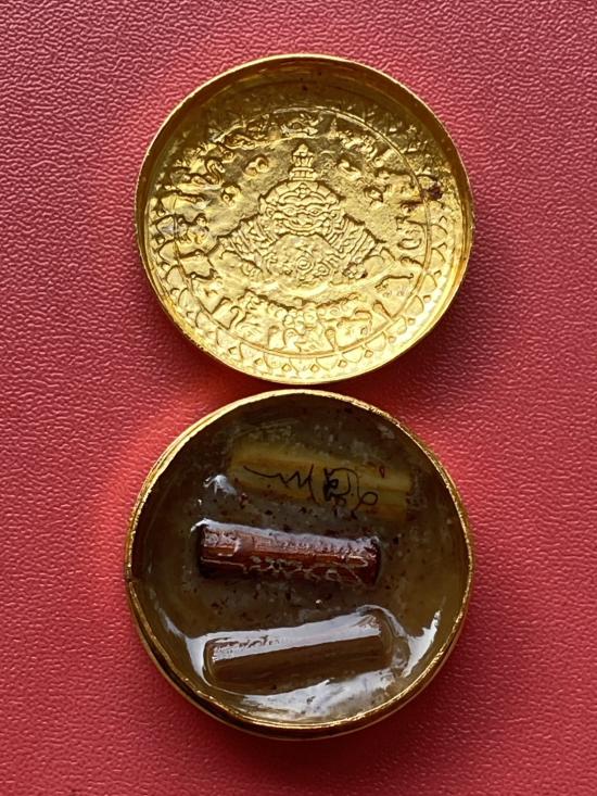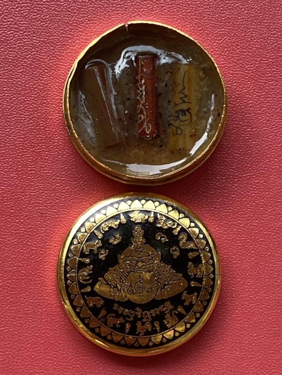 เคาะเดียวแดง สีผึ้งพระราหู รุ่น มงคลจักรวาล เนื้อ โลหะชุบทองลงยาสีดำขอบสีดำ ขนาด3.2ซม |