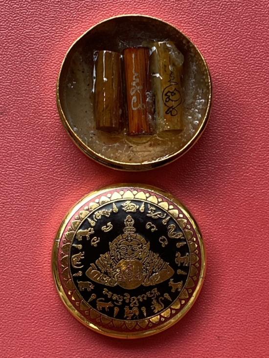 เคาะเดียวแดง สีผึ้งพระราหู รุ่น มงคลจักรวาล เนื้อ โลหะชุบทองลงยาสีดำขอบสีแดง ขนาด3.2ซม |