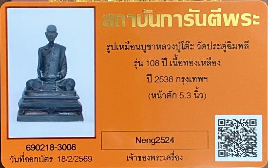 สวยแชมป์เปี้ยนโลก รูปเหมือนบูชาหลวงปู่โต๊ะ วัดประดู่ฉิมพลี รุ่น 108 ปี เนื้อทองเหลือง ปี 2538 (หน้าตัก5.3 นิ้ว)+ บัตร g pra ครับ