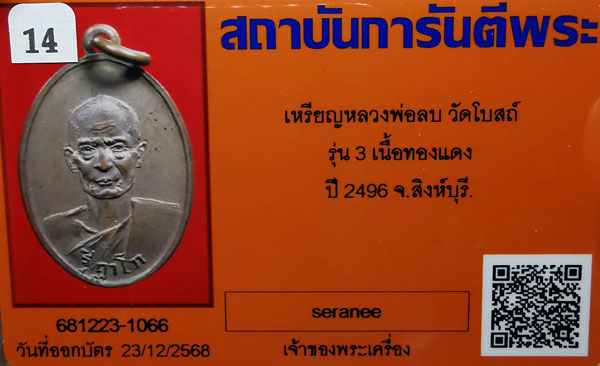 เหรียญหลวงพ่อลบ วัดโบสถ์ รุ่น3 เนื้อทองแดง ห่วงเดิม ปี2496 จ.สิงห์บุรี + บัตรG-pra สภาพเดิมค่ะ สภาพตามรูปทุกประการค่ะ