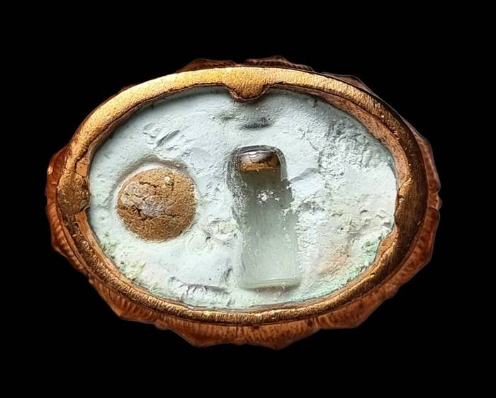 ใต้ฐานขององค์พระจะเทปูนพลาสเตอร์ปิด และบรรจุเกศาหลวงพ่อพรหม ใส่ในขวดแก้วไว้ทุกองค์ และมีลูกอมบรรจุไว้ 1 เม็ด โดยลูกอมดังกล่าว ได้นำมวลสารจากการบูรณะกุฏิหลวงพ่อ เป็นพระพิมพ์หลวงพ่อขันปี 25 ที่ชำรุด ผงงาช้าง ปี 26 พระผงรุ่นต่างๆของหลวงพ่อพรหมที่ชำรุด ผงรุ่น 100 ปีชาตกาล