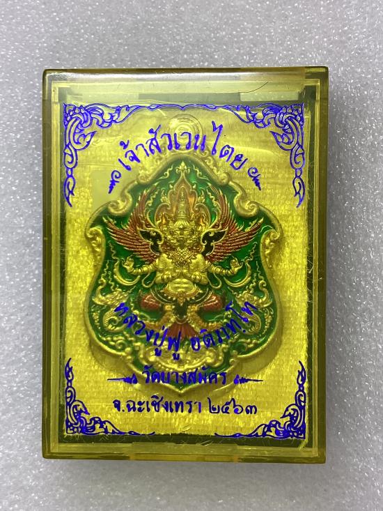 เหรียญพญาครุฑ รุ่น เจ้าสัวเวนไตย หลวงปู่ฟู อติภทฺโท วัดบางสมัคร จ.ฉะเชิงเทรา เนื้อทองทิพย์ ลงยาสีเขียว -ดำ -แดง -เหลือง กล่องเดิม |