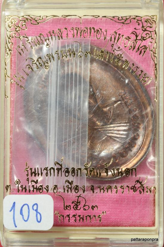 เหรียญหลวงพ่อทอง รุ่นเจริญพรบน ๖๓ ปี 2563 เนื้อทองแดงไม่ตัดปีกหลังแบบ กรรมการตอก๙รอบ มีจาร หมายเลข 108 |