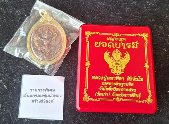 เหรียญพญาครุฑ หลวงปู่ศิลา วัดโพธิ์ศรีสะอาด รุ่นยอดบารมี ลังนำฤกษ์ เนื้อทองแดงซาติน เลี่ยมกรอบชุบน้ำทอง No.23 |
