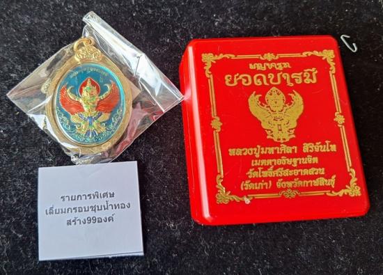 เหรียญพญาครุฑ หลวงปู่ศิลา วัดโพธิ์ศรีสะอาด รุ่นยอดบารมี ลังนำฤกษ์ เนื้อทองทิพย์ ลงยาทรงเครื่อง ลงยาปีกครุฑ พื้นฟ้า เลี่ยมกรอบชุบน้ำทอง No.73 |