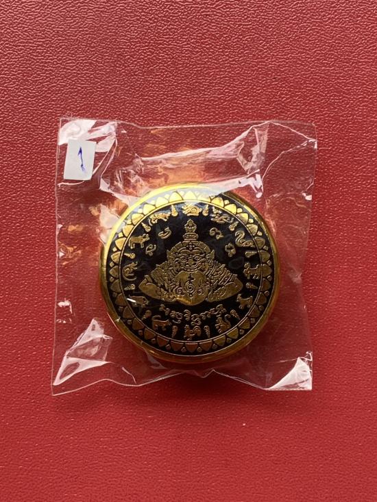 เคาะเดียวแดง สีผึ้งพระราหู รุ่น มงคลจักรวาล เนื้อ โลหะชุบทองลงยาสีดำขอบสีดำ ขนาด3.2ซม |