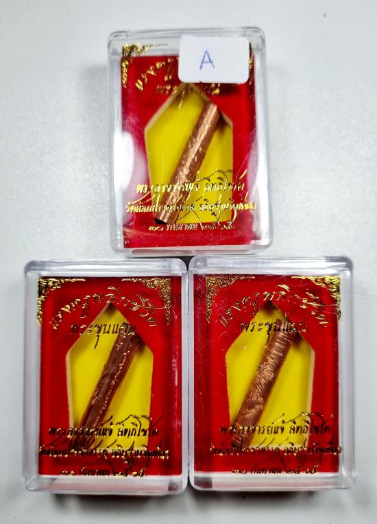 ตะกรุดหนุมาณเชิญธง แรงครูพลิกชีวิต พระอาจารย์แจ้ เนื้อทองแดงกรรมการ3ดอก พร้อมกล่อง (A) |