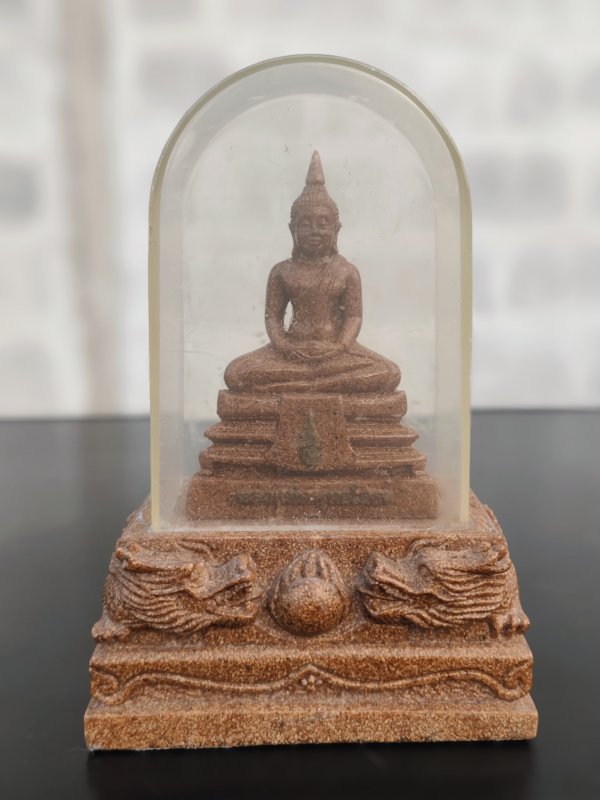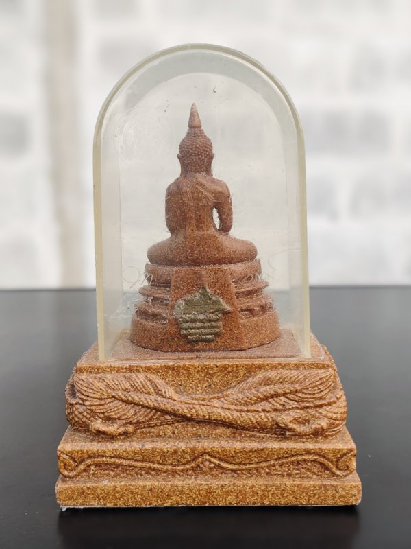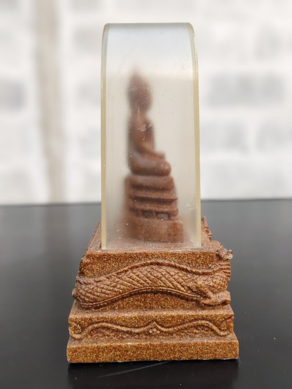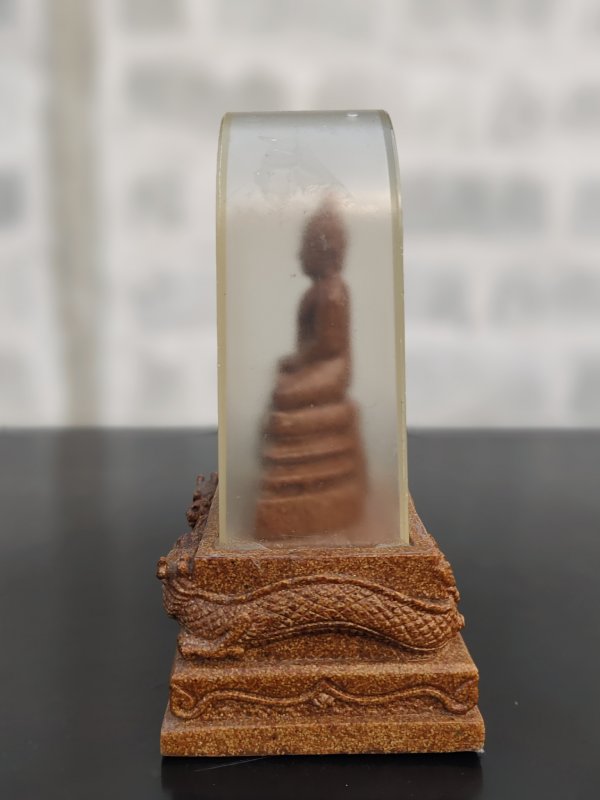 พระบูชาหน้ารถ หลวงพ่อโสธร สธ. รุ่นสร้างพระอุโบสถหลังใหม่ ปี38 (ตรงปี) เนื้อกระเบื้องหลังคาโบสถ์ ฐานตรายาง ฝังเหรียญ |