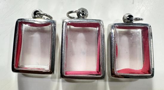ตลับมือสองสแตนเลสทรงสี่เหลี่ยมใส่พระคำข้าวหรือพระวัดปากน้ำได้ 3 ใบแบบเปิดหน้า-หลังขนาด 3 x 2.5 ซม. |