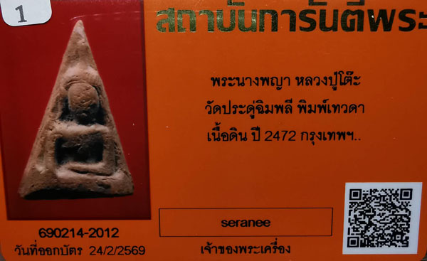 พระนางพญา หลวงปู่โต๊ะ วัดประดู่ฉิมพลี พิมพ์เทวดา เนื้อดิน ปี2472 + บัตรG-pra สภาพเดิมค่ะ |