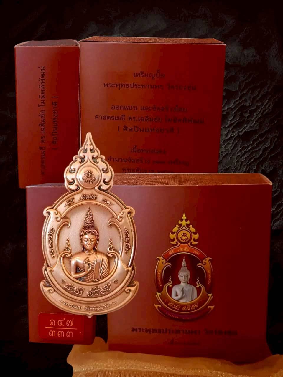 กราบขออนุญาตท่านอ.เฉลิมชัย โฆษิตพิพัฒน์ นำเสนอ เหรียญปั๊ม "พระพุทธประทานพร" ที่ระลึกวัดร่องขุ่น เนื้อทองแดงซาติน หมายเลข ๑๔๗/๓๓๓ อุปกรณ์ครบ |