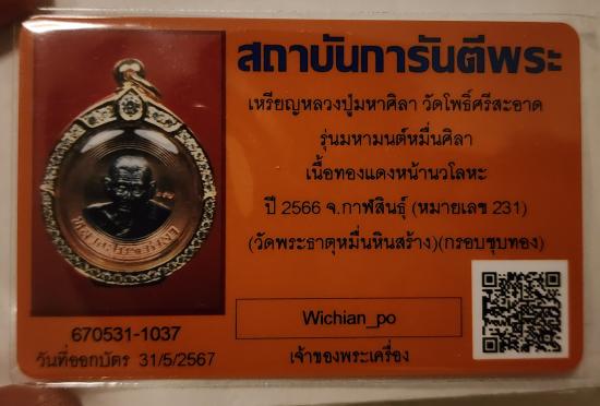 (แบ่งปัน) เหรียญหลวงปู่มหาศิลา วัดโพธิ์ศรีสะอาด รุ่นมหามนต์หมื่นศิลา เนื้อทองแดงหน้านวโลหะ ปี 2566 จ.กาฬสินธุ์ หมายเลข 231 (วัดพระธาตุหมื่นหินสร้าง)(พร้อมกรอบทองอิตาลี)+บัตร G-pra |
