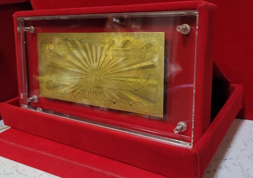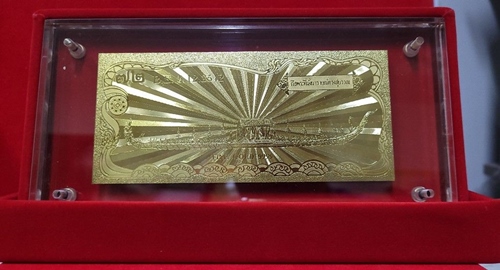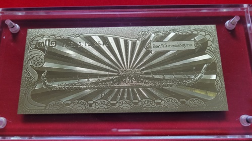 แผ่นทองคำแท้ 2หน้า 99.75% สร้างในวาระ เฉลิมพระชนมพรรษา ในหลวงรัชกาลที่ 9 ครบ 6รอบ 72พรรษา พ.ศ.2542 ด้านหลัง ภาพเรือพระที่นั่งนารายณ์ทรงสุบรรณ พร้อมกล่องกำมะหยี่สามารถปรับตั้งในตู้โชว์ได้,มีใบกำกับรับรองแผ่นทองคำแท้