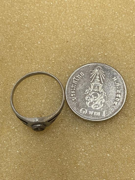 แหวนหัวนะโมเนื้อเงิน ตัวเรือนเป็นอัลปาก้าไม่ทราบที่ครับ |