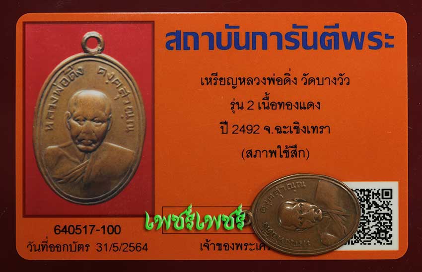 เหรียญ หลวงพ่อดิ่ง วัดบางวัว รุ่น2 เนื้อทองแดง ปี2492 จ.ฉะเชิงเทรา สภาพกำลังน่าใช้ พร้อมบัตรรับรองพระแท้จากการันตีพระสบายใจได้พระแท้แน่นอน ค่ะ